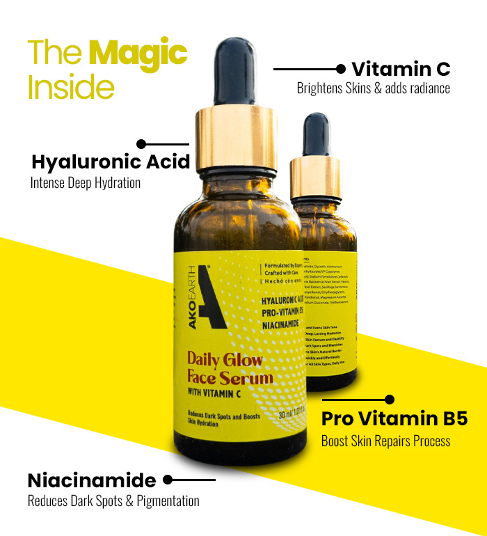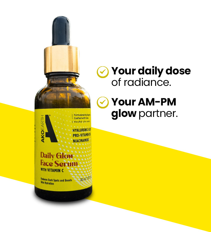 Cleanse your face with a gentle face wash to remove impurities. Dispense 2-3 drops of Daily Glow Face Serum onto your fingertips and gently pat onto your face and neck, avoiding the eye area. Follow with AKOEARTH Night Cream or Glow Moisturizer to lock in hydration. Use twice daily, morning and night, for best results. Apply sunscreen during the day for protection and a lasting glow.